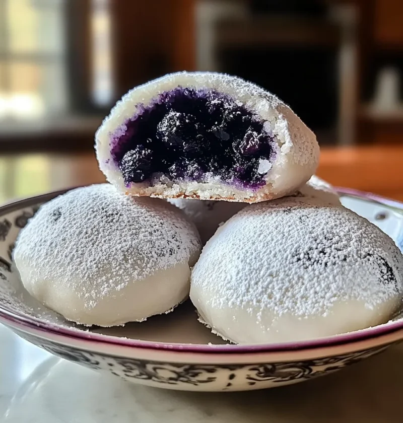 These Blueberry-Filled Almond Snowball Cookies combine a buttery almond dough with a hidden blueberry jam filling, rolled in powdered sugar for a signature snowy finish. They bake into soft, round cookies with a tender crumb and a sweet, fruity center. Easy to prepare and perfect for festive occasions, they’re a charming twist on a traditional almond snowball.